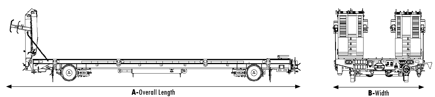 KEY FEATURES: • Width: 8 feet • Length: 24 feet • Height off rail: 22.00 inches •Wide gauge: 66 inches • 4 wheel air brake LOAD RATING: 35 Tons (US) WEIGHT: 8,380 lbs |